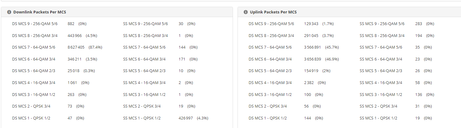 Provide pic of Monitoring > Performance > Downlink/Uplink packets per MCS section of both AP and SM in question.