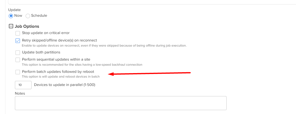 To perform batch updates and reboots - Enable “Perform batch updates followed by reboot” under Job options.