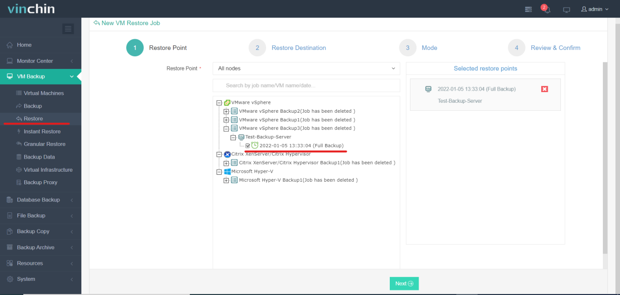 Select VM Backup → Restore to create a New VM Restore Job. In the New VM Restore Job window, select the Restore Point from the VM to recover.