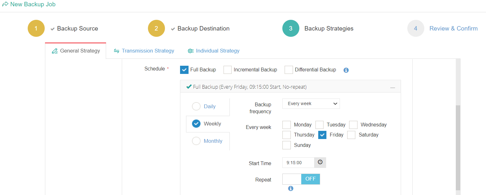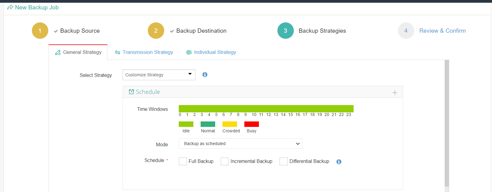 In the Backup Strategies window, schedule the backup by selecting the Mode and the Start Time. In the Mode drop-down, you can select “Once off Backup”, or “Backup as scheduled”. You can schedule the backup either as Full Backup, Incremental Backup or Differential backup and select the frequency and time. If required change the options under Data Storage Policy, Retention Policy and then click Next.