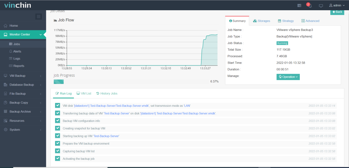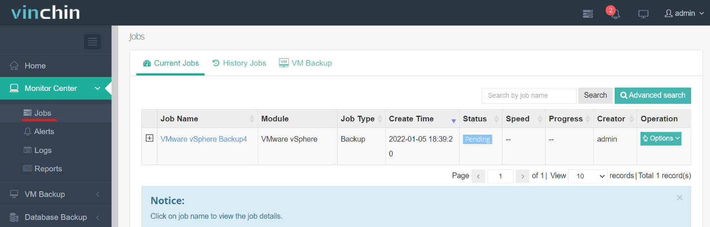 Once the backup job is completed, you can check the status on the Monitor Center → Jobs → History Jobs.