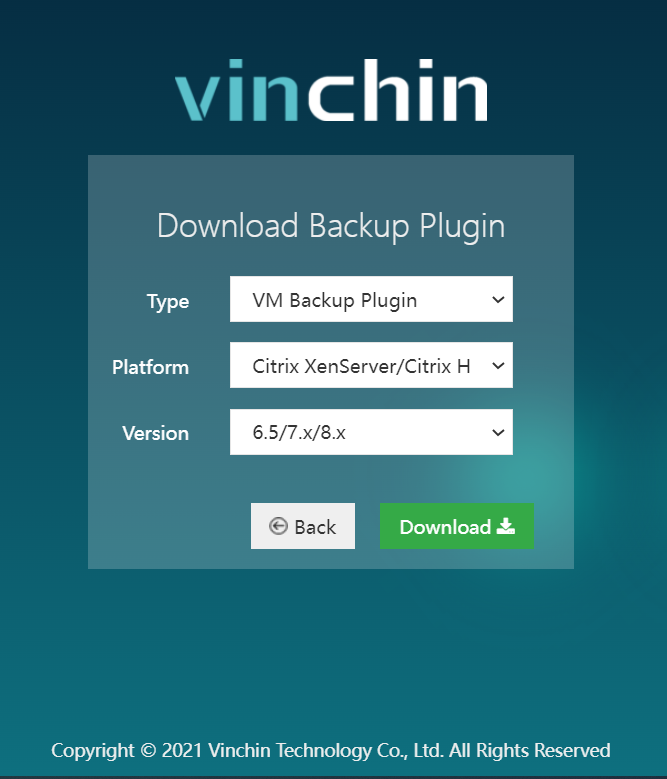 In case of Microsoft Hyper-V or Citrix Hypervisor/ Citrix XenServer, download the backup plugin and install in the VMs where cnMaestro is running. You can download the Backup plugin from the login screen of Vinchin.