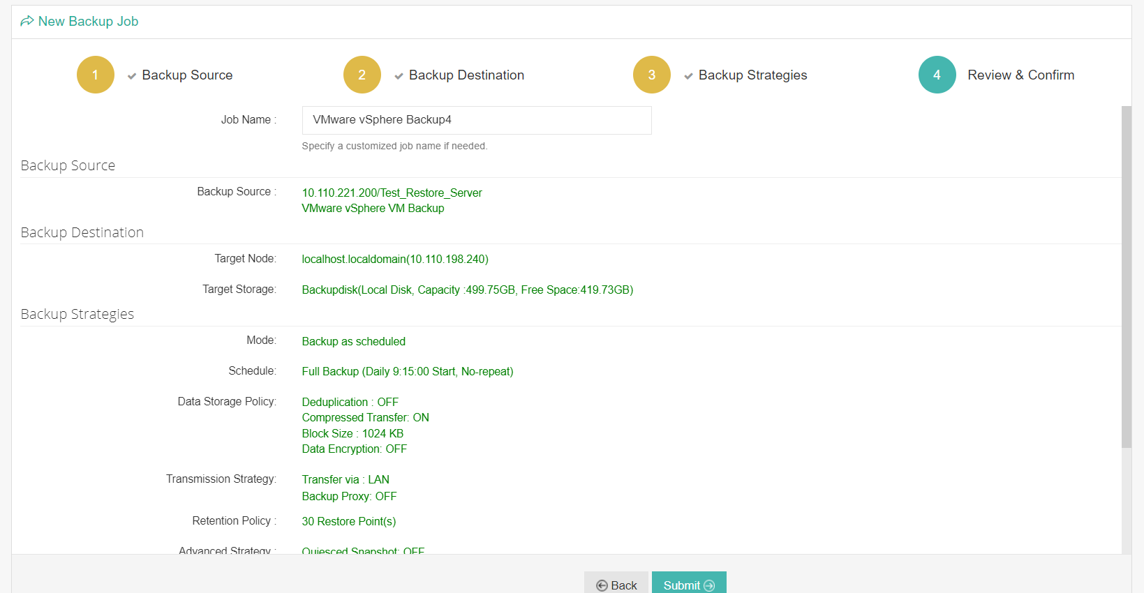 In the Review & Confirm page, review the selection and click Submit. Once submitted, the backup job will be scheduled.