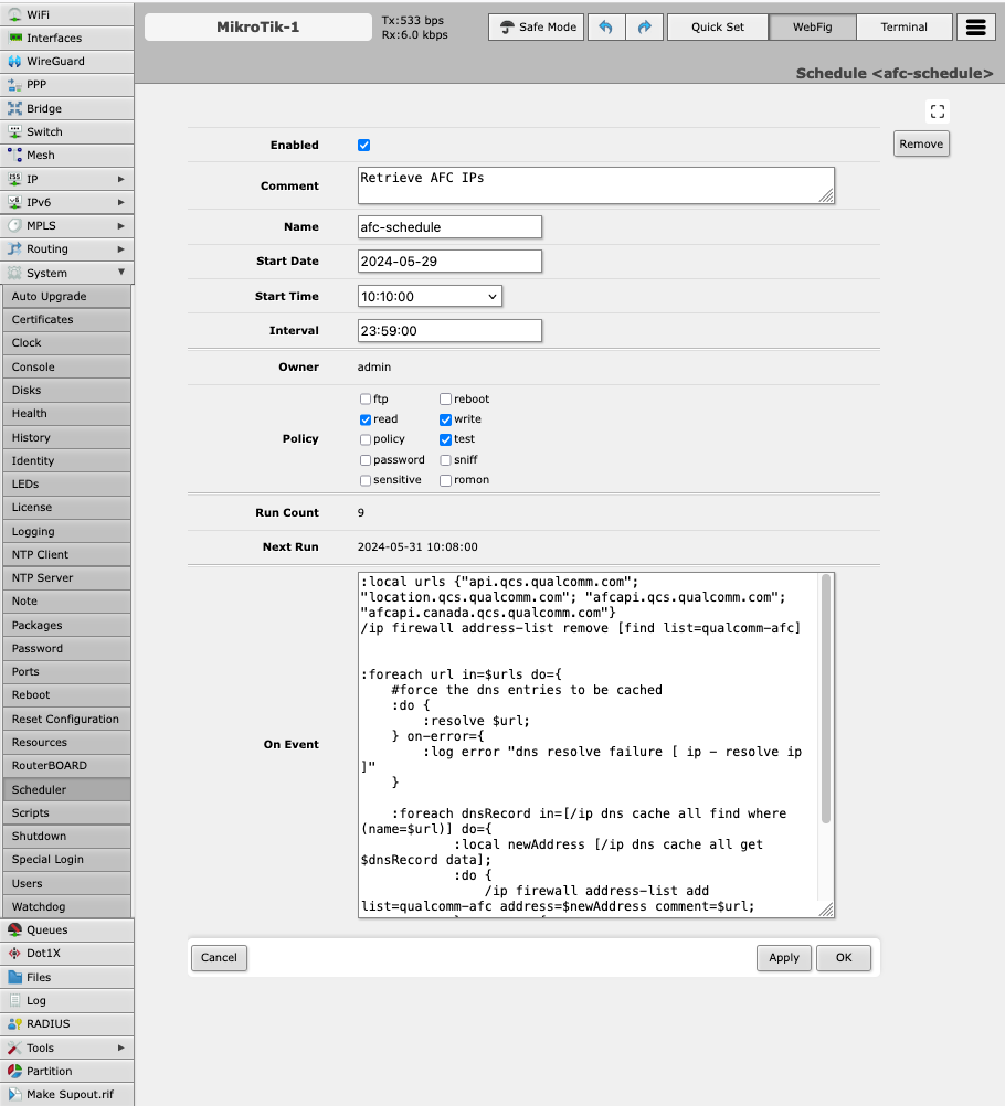 - On MikroTik router create new event in System - Scheduler: