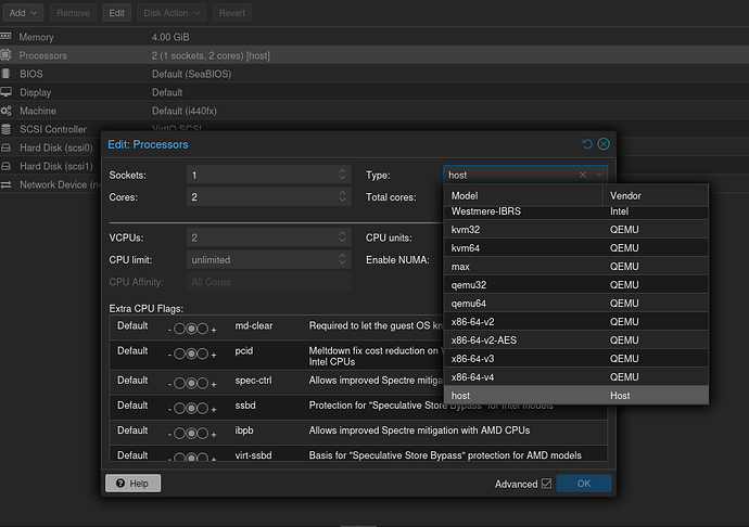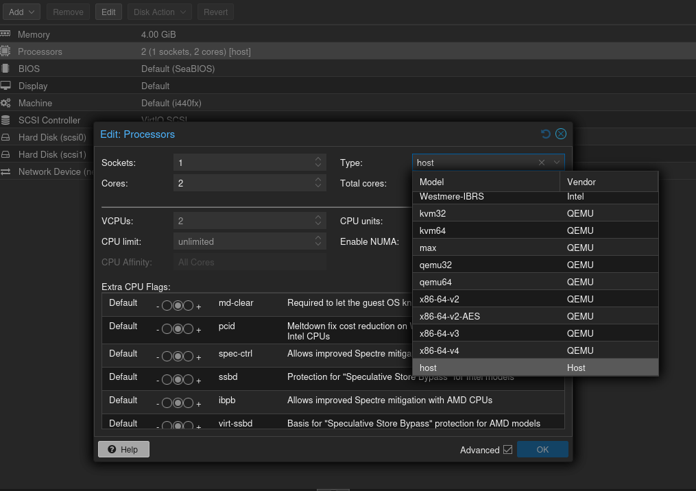 - WARNING: this may break live migrations if your vm hosts have different CPUs. You may want to generate a custom CPU definition for your cluster if you are using different hardware: cpu-models