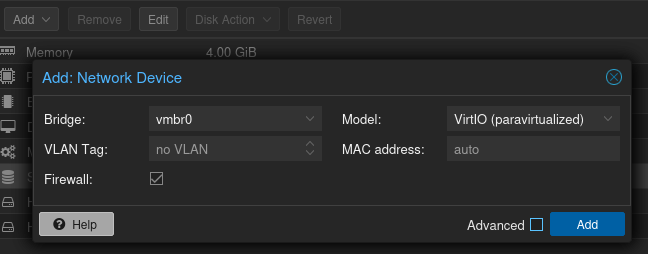 - Add a VirtIO network interface, and connect to the correct bridge or network