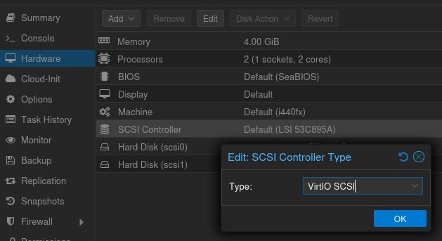 qm importovf ${VMID} ./cnmaestro-on-premises_5.0.0-r5_amd64.ovf lvm-disks - In the gui, change the SCSI controller to Virtio SCSI