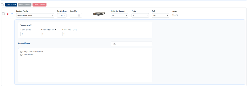 (located beside the Product Family field) to access more detailed configuration options such as transceiver configurations and antenna selections, depending on the chosen product. - Select the parts from the “Optional Extras” section to manually add optional components not automatically included in the default configuration.