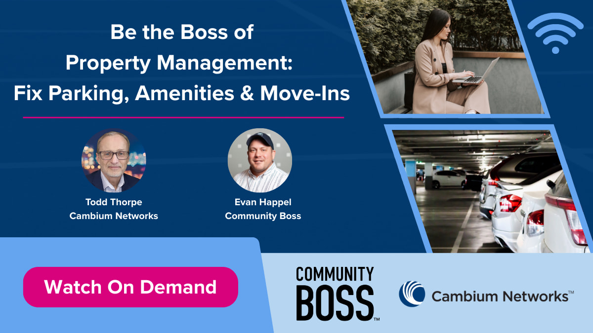 Join Todd Thorpe with Cambium Networks and Evan Happel with Community Boss where they unpack real-world strategies to simplify daily headaches like guest parking, overbooked amenities, and onboarding friction.