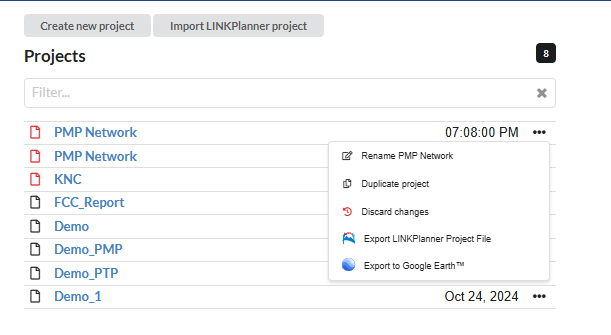 To export a LINKPlanner project from the Project List window, click the “…” next to the project name, then select Export LINKPlanner Project File.