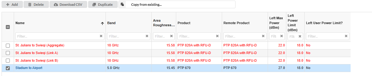 The PTP Links, PMP Network Device, PMP Links, and Subscriber Modules tables allow a device (row) to be used as an equipment template, which can be applied to create new ones using that configuration.