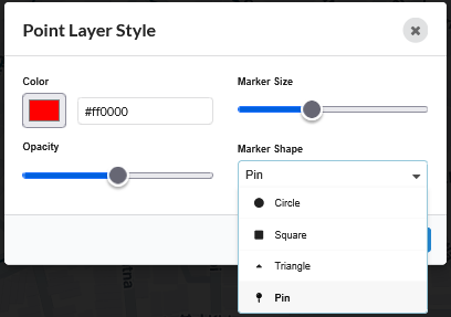 icon. The Style Edit window will open. For the Point layer, color, marker size, opacity, and marker shape can be customized. For the Line layer, color, line thickness, opacity, and line style can be customized. For the Polygon layer, color and opacity can be customized.