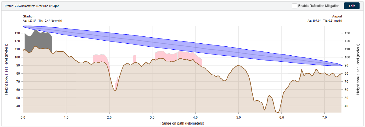 The Profile View now displays the antenna azimuth and tilt for each side of the link. Tilt is displayed in red when the link is obstructed.