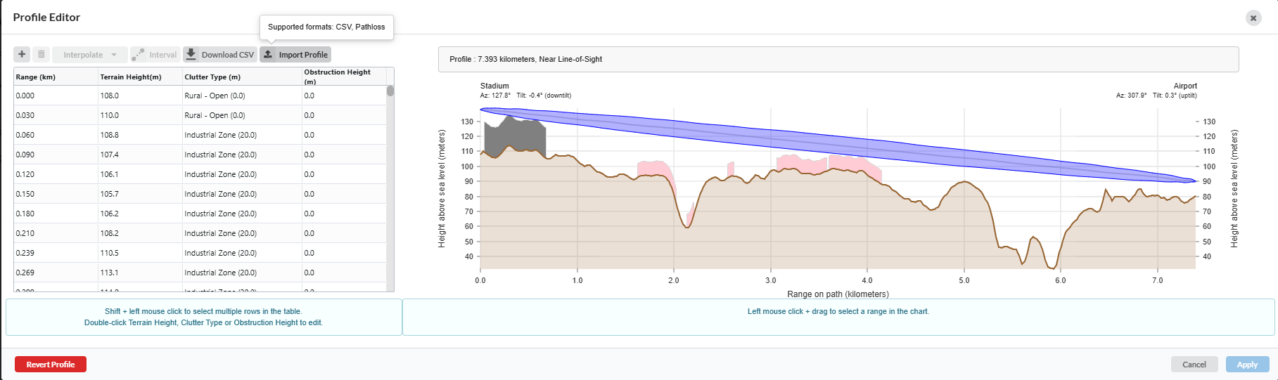 Path profiles can be imported from Pathloss text reports, using the Terrain profile listing which will give the name and co-ordinates of each site and the path profile including obstructions between the sites. Pathloss reports may contain multiple links, however LINKPlanner can only import one profile per file.