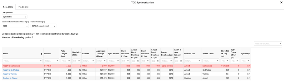 For data rates to be accurate, they must first be valid. If the TDD synchronization settings are invalid, the link will be highlighted with a pink background, and the Aggregate Throughput will drop to zero.