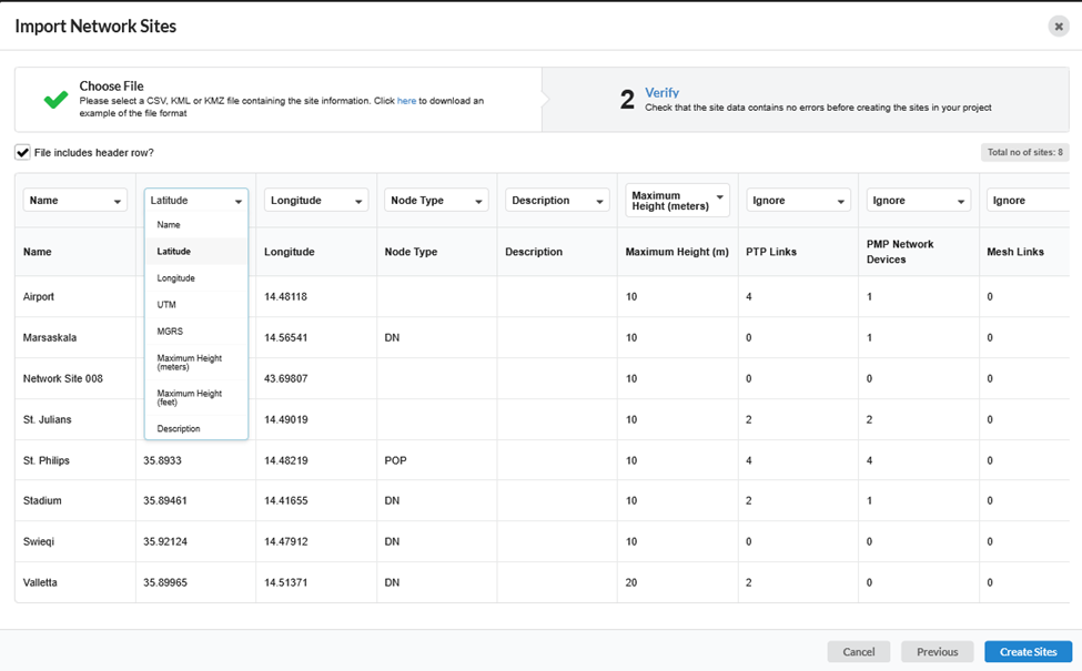 Importing your site data into LINKPlanner just got a lot more flexible! We have added new column selection options to the site CSV import process. This means you can bypass the hassle of strictly formatting your spreadsheets before importing. Simply upload your CSV file and use the options to choose exactly which columns correspond to your site details (such as Name, Latitude, and Longitude).