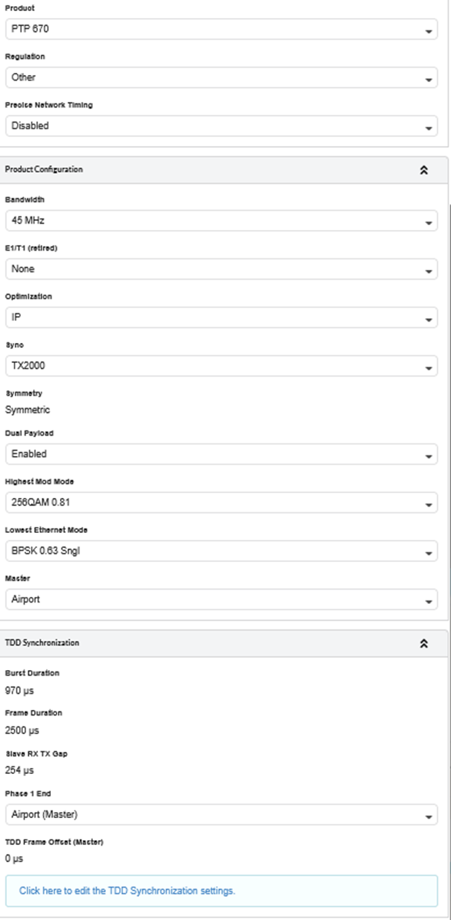 PTP 670/700 products now support external synchronization in LINKPlanner. Once external synchronization is enabled, a new TDD Synchronization Sub-Panel appears, allowing you to view and adjust the TDD settings for individual links.