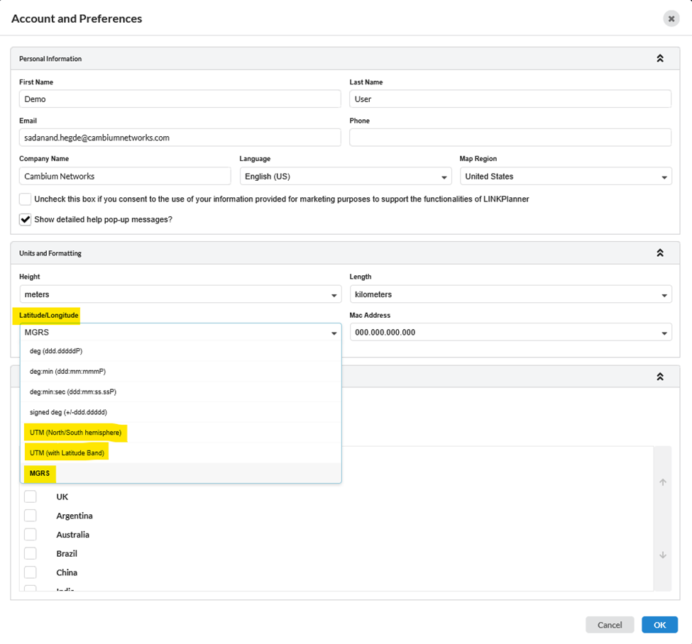To use UTM/MGRS coordinate references in the LINKPlanner project, navigate to Preferences. In the Latitude/Longitude field under Units and Formatting section, select the UTM/MGRS option.