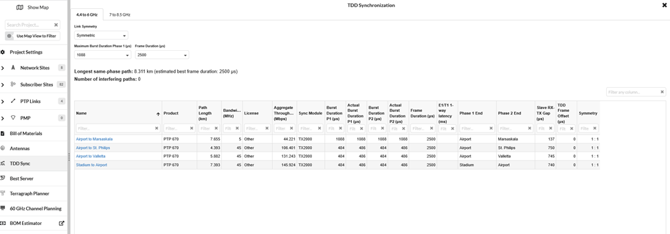 Use the TDD Sync list to set the Link Symmetry and adjust the Maximum Burst Duration and Frame Duration. When the network is symmetric, only the Maximum Burst Duration for Phase 1 needs to be configured. For asymmetric networks, the Maximum Burst Duration must be set for both Phase 1 and Phase 2.