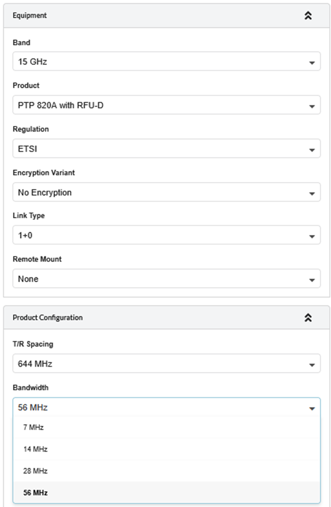To use 644 MHz T/R Spacing for PTP820A with RFU-D HP in15 GHz band, select “ETSI” Regulation and then select the 644 MHz T/R Spacing option. Available bandwidth options are 7, 14, 28 and 56 MHz.