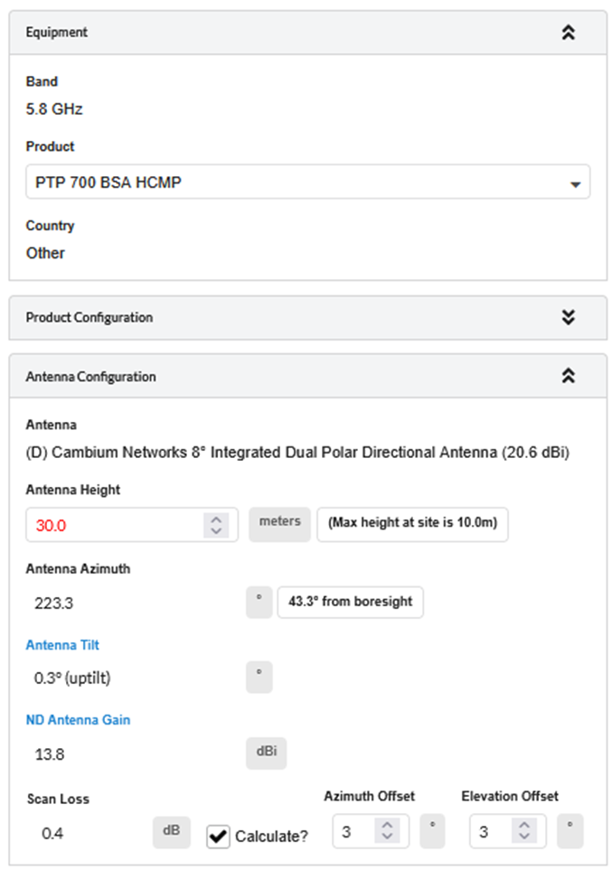 To calculate the Scan Loss automatically, check the “Calculate” box next to the Scan Loss field and enter the Azimuth and Elevation Offset angles from the boresight, in degrees.