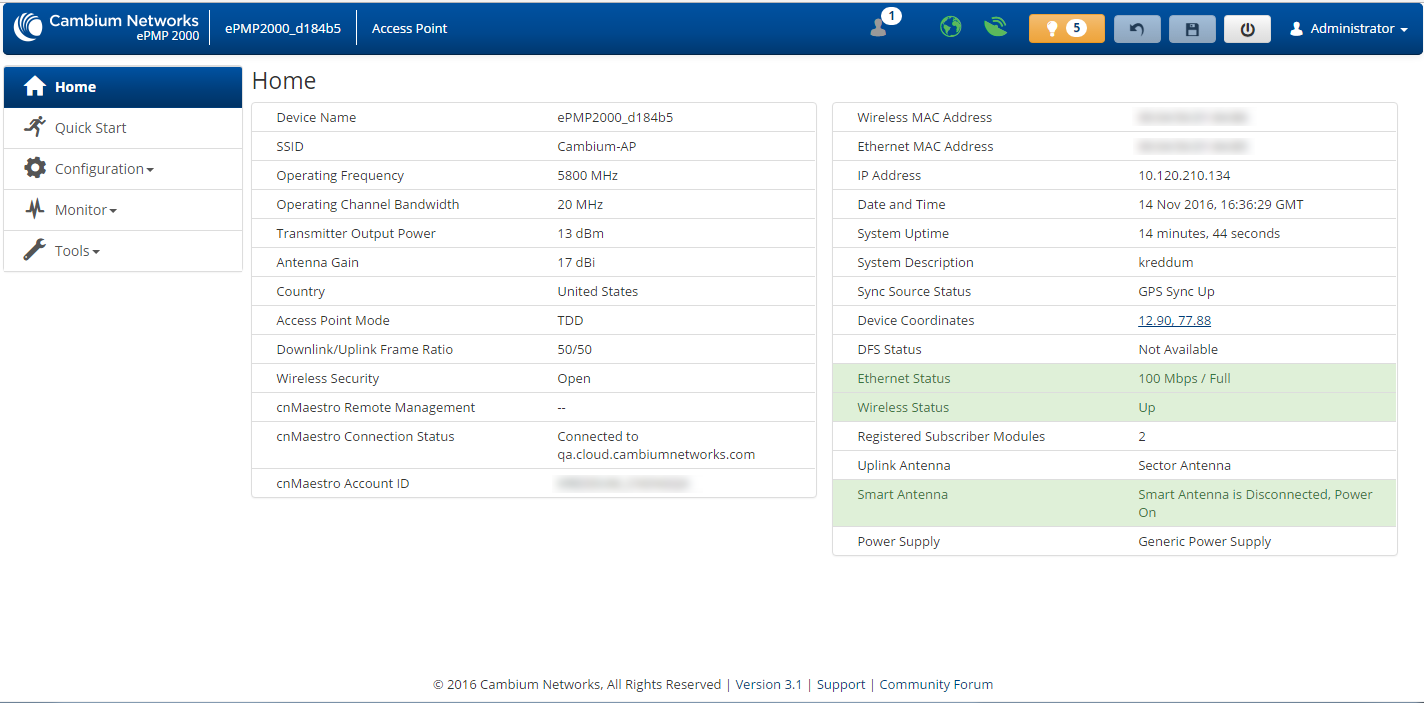 Indicates whether the device is currently configured to be managed by the Cambium cloud management system – cnMaestro™. |