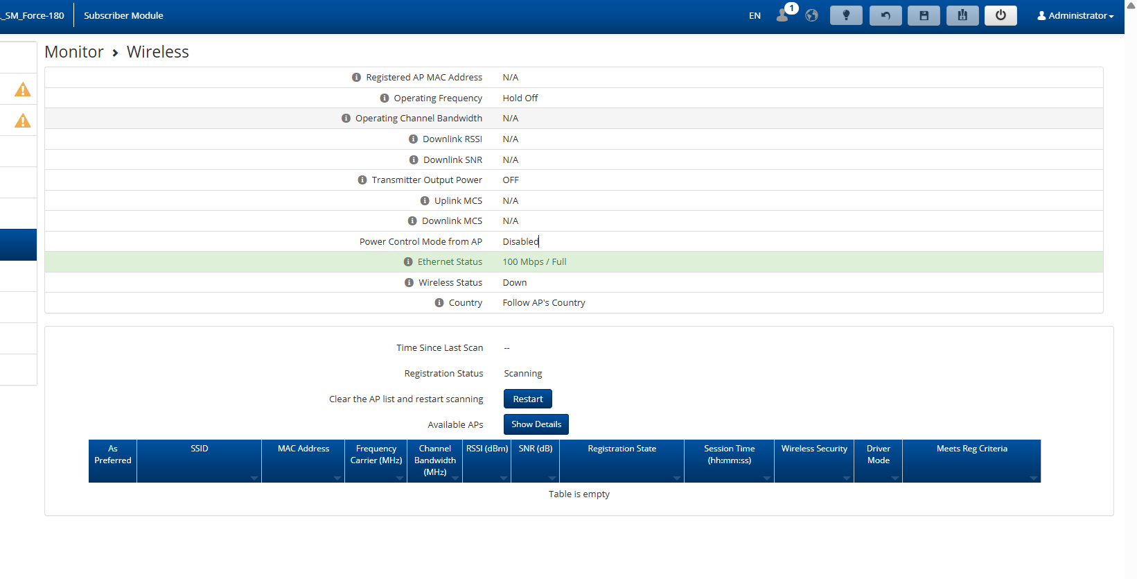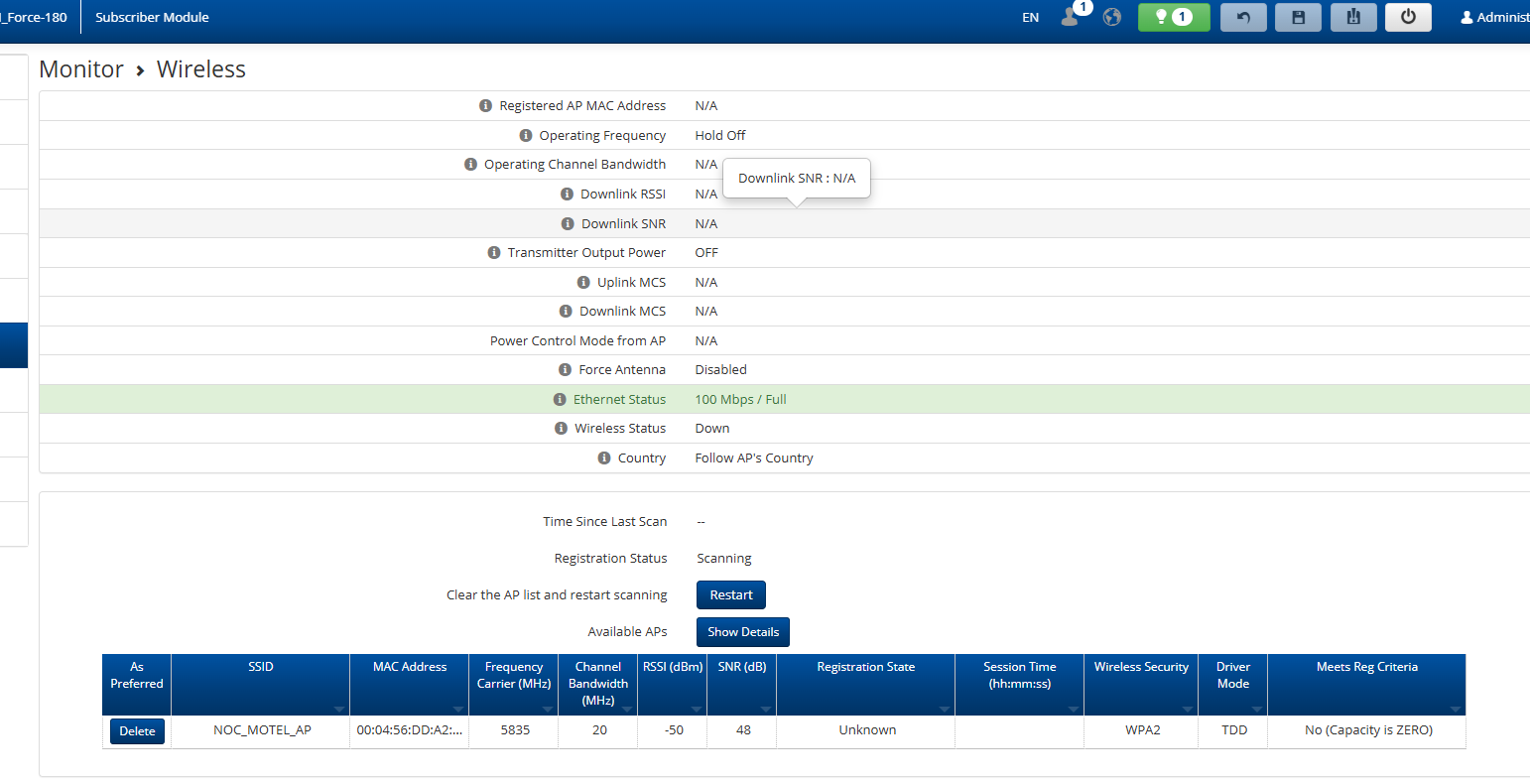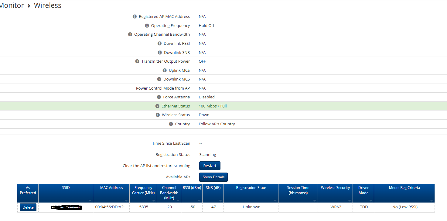 So, make sure on the unit you have configured as an AP, make sure that the âMax Registrations Allowedâ is set as high as it allows (10 or 12 or whatever) while you are testing. So, even if youâre only trying to connect one SM, I would still have it set to its maximum number for testing.