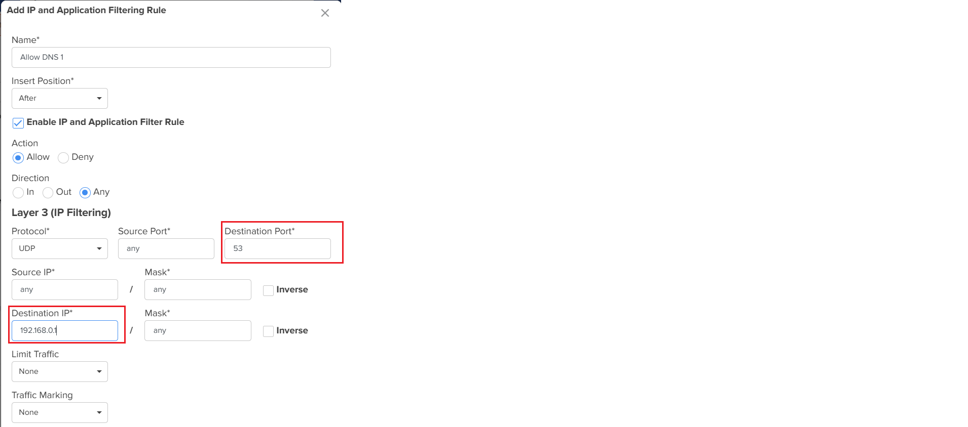 - Destination IP: Primary DNS Server (example: 192.168.0.1)