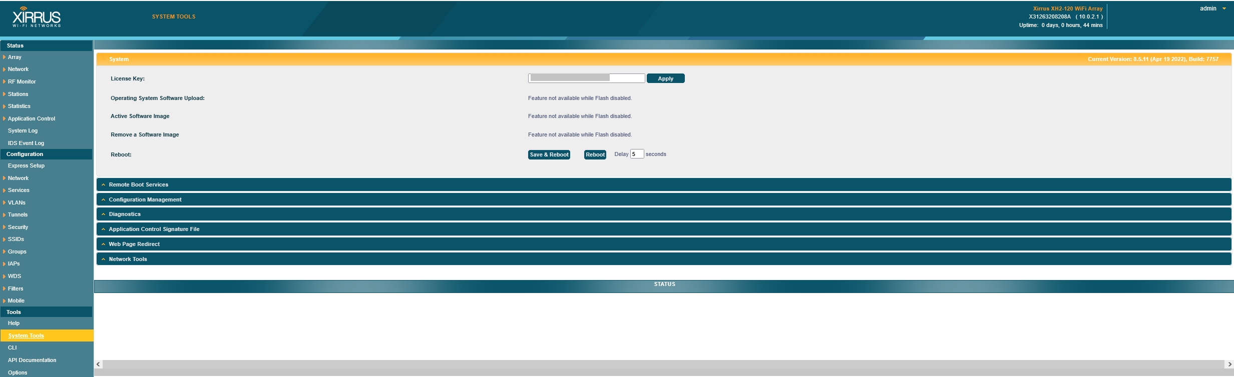 After the reset, the device wouldn’t start the web interface. I managed to flash the firmware again using XIRCON, accessed it again through the web interface, but the option to flash the firmware shows: Feature not available while Flash disabled.