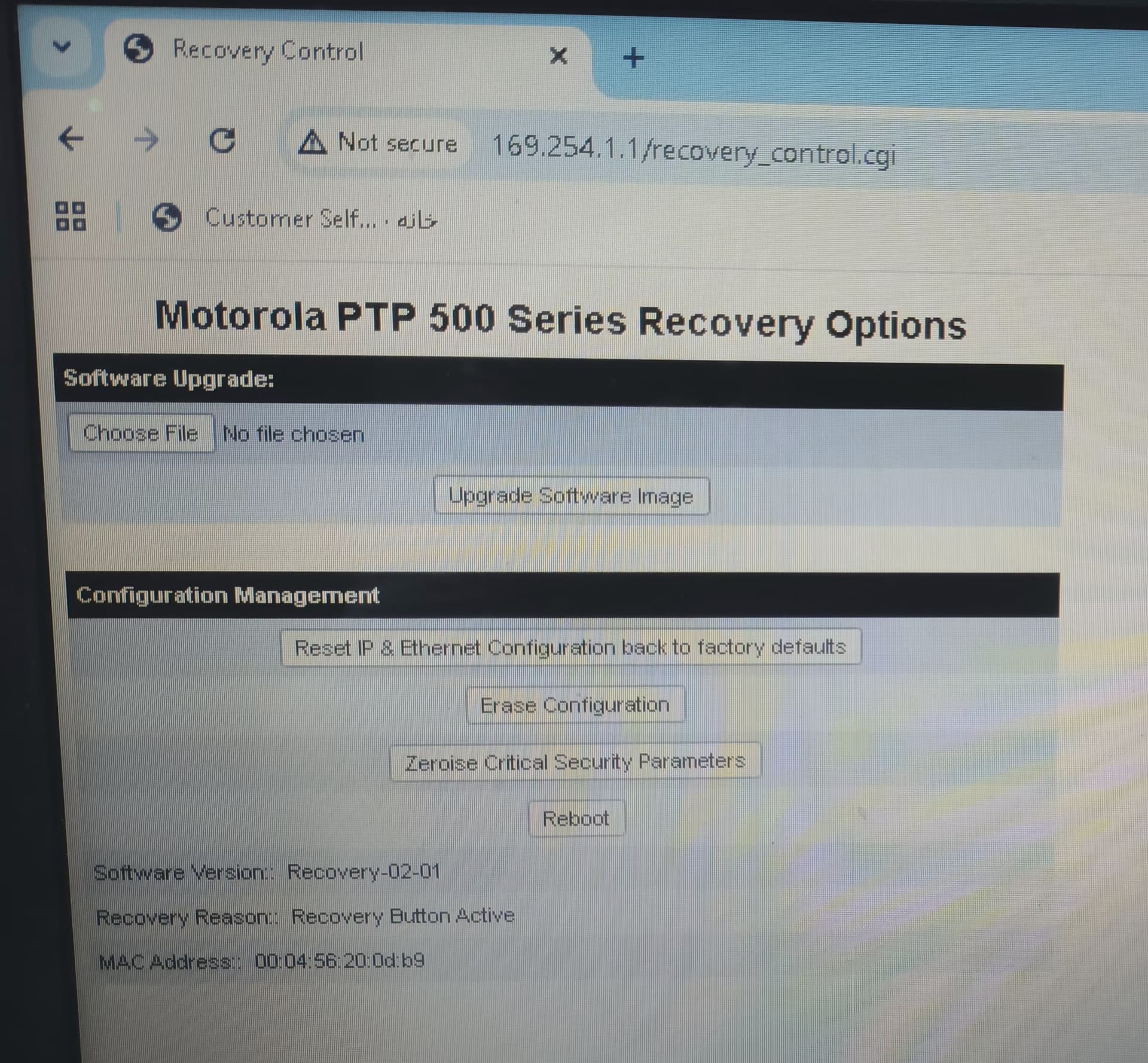 I have four PTP 54500 radios that were installed on a telecommunications tower 18 years ago. After replacing the cable and patch cord from the radio to the switch, all four radios went into recovery image mode and their IP changed to IP 169.254.1.1