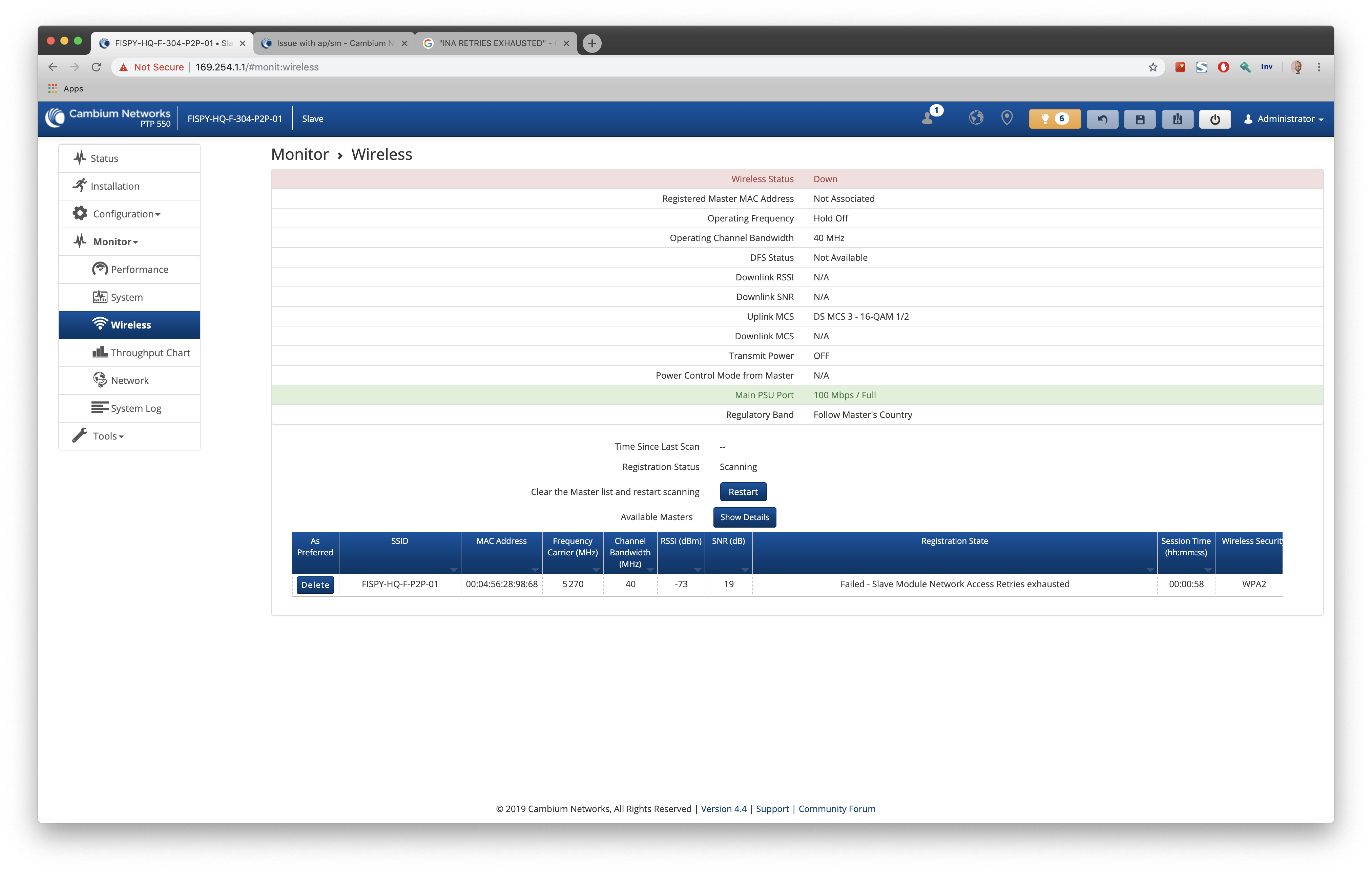We have a PTP550 link that has been working for over the last 7 months. We move the SM to a different location with the same exact confirguration, and we are getting an error of