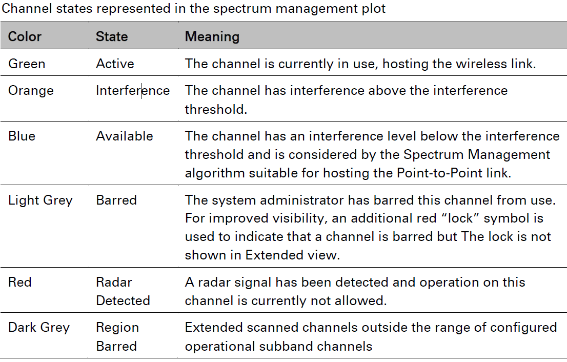 The individual channel metrics are displayed using a colored bar and an “I” bar. The colored bar represents the channel state. The “I” bar indicates the maximum and the minimum level of interference for that channel/frequency. When considering the interference level for the Link planner, the “I” bar should be considered.