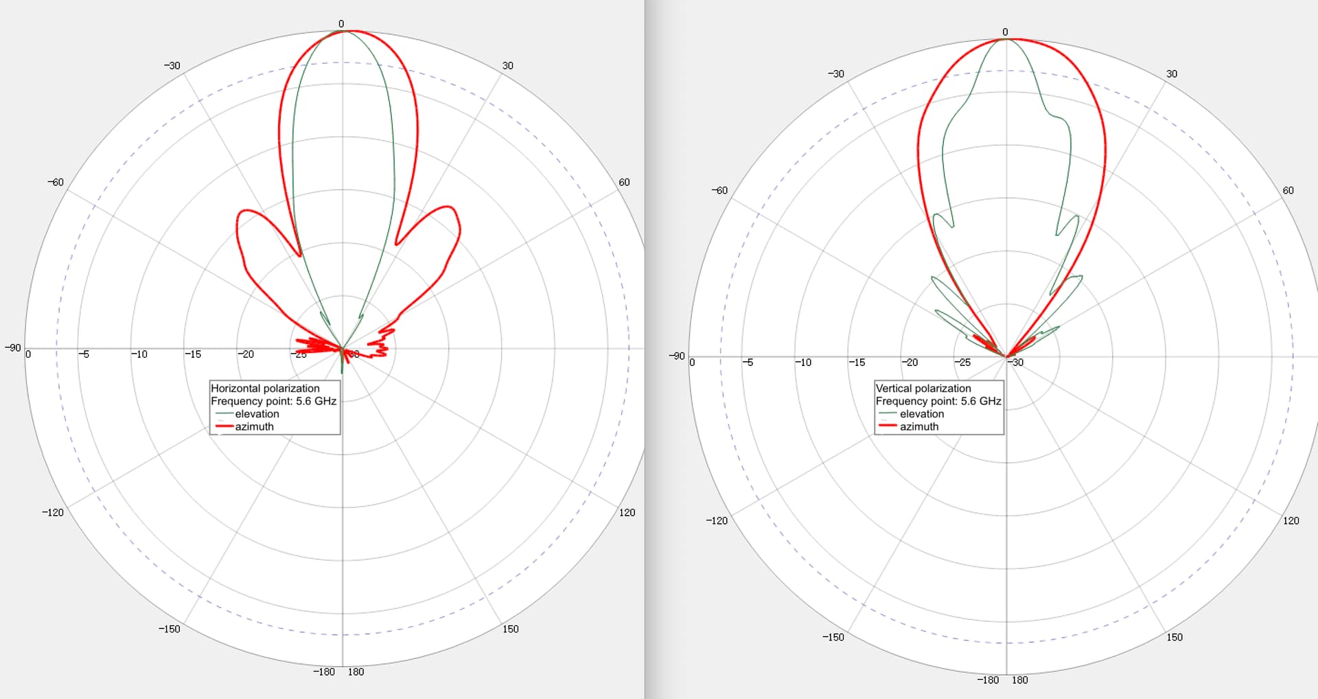 These are the radiation patterns for the Cyber Antennas horns at 5.3 GHz with half-power beamwidths of 22° for the horizontal polarity and 30° for the vertical polarity.