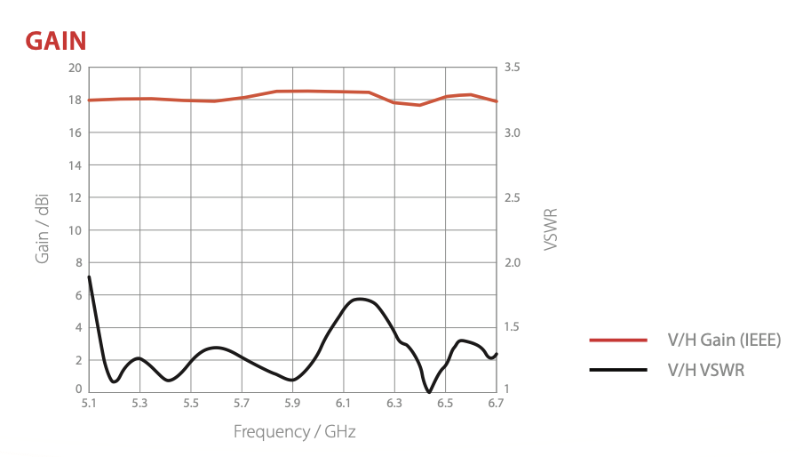 At 5.3 GHz, the gain for the horizontal polarity is 19.3 dBi and vertical polarity is 18.0 dBi.