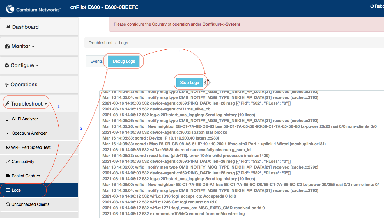 - Go to Troubleshoot → Logs → Debug Logs section and press Start Logs button