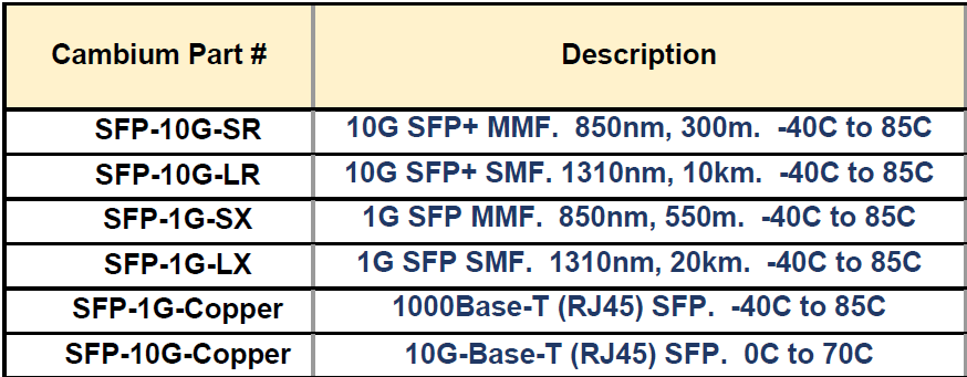 Currently we do not offer a Cambium branded BiDi transceiver. As you are probably aware, we do offer the following suite of 1G/10G fiber and copper transceivers: