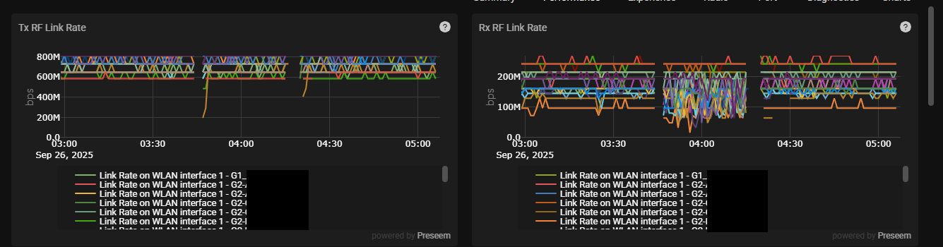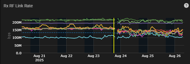 Here is a photo of the SM rates from the AP perspective. The first gap in the charts is the change from Beamforming only to MU-MIMO on the AP. The second gap is the mass reboot of all the SMs. Pretty easy to see the bad UL rates.