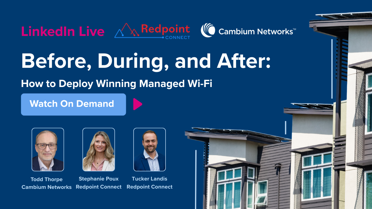 Join Todd Thorpe with Cambium Networks and Stephanie Poux and Tucker Landis with Redpoint Connect for a special LinkedIn Live deep dive into the three critical stages of a managed Wi-Fi deployment: Before, During, and After.