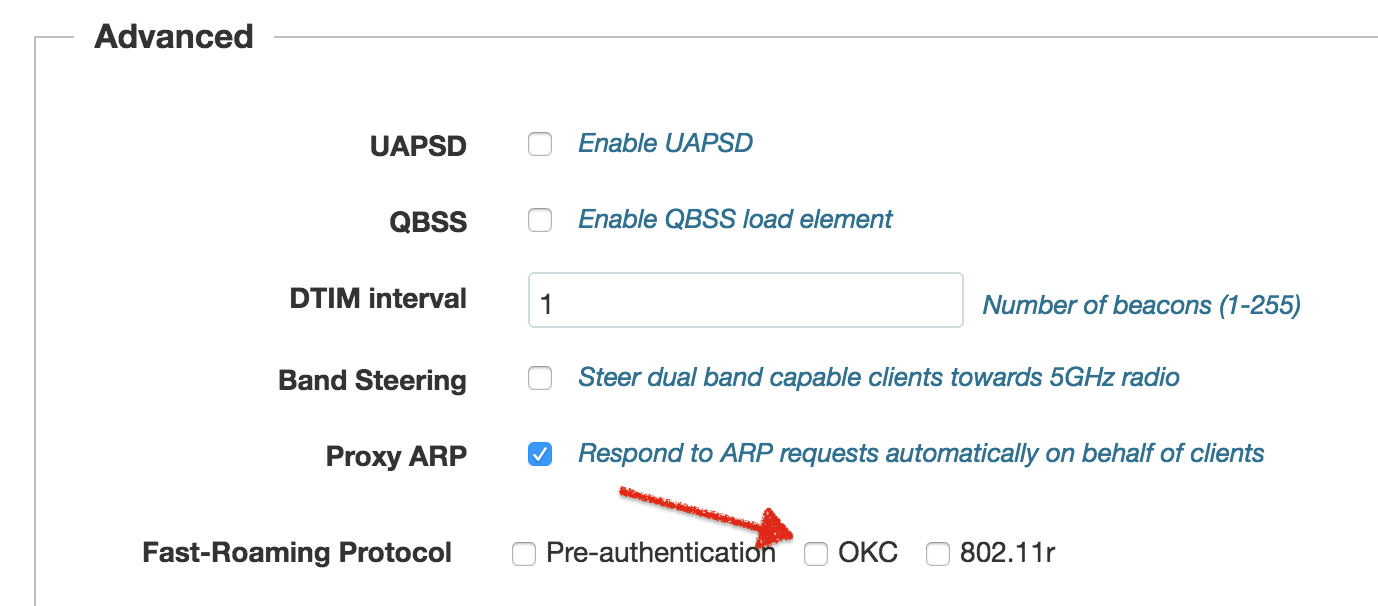 OKC can be configured under the wireless LAN advanced configuration settings. If WPA2-Enterprise is being used, we would recommend turning on OKC.