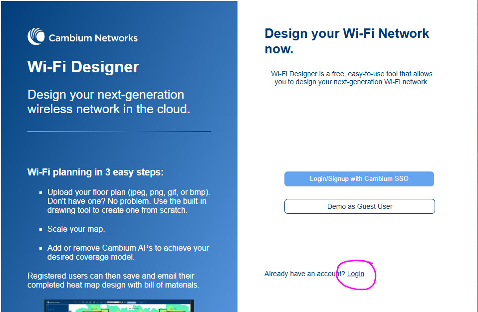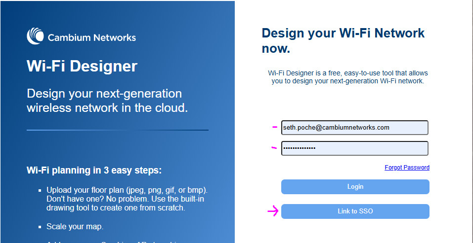 So logout of WiFi Designer. At the main sign-in page towards the bottom you will see a link that says “Already have a login?”. Click that link. Fill in your legacy credentials and click the “Link to SSO” button.All of your original maps will then be copied to your SSO profile. Let us know if that doesn’t work.
