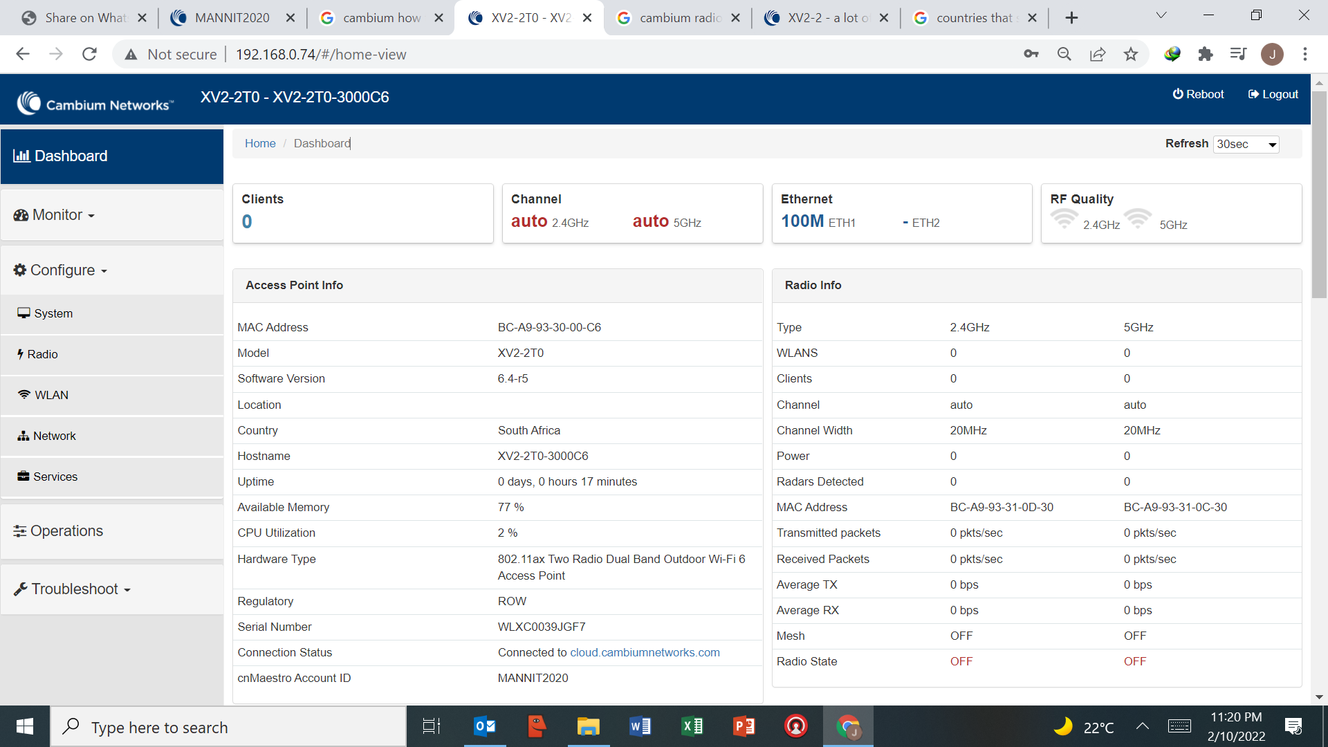 Hello All, based on a similiar post by Justin on another thread and just to let people know this issue was resolved. The issue was the AP was seeing LLDP packets from the PoE switch, through the mid-span PoE injector and the switch was advertising very low power allocation via LLDP to the XV AP. This was causing the AP to think it had very little PoE power allocated to it so the AP, in order to prevent itself from going into a PoE power boot loop disables the radios, Bluetooth and USB. Disabling LLDP on the AP resolved this issue. LLDP Request Power (aka LLDP power negotiation) being disabled while LLDP still being enabled also could have been a resolution for this issue.